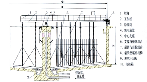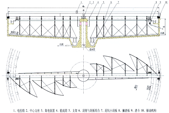 驅(qū)動(dòng)裝置推動(dòng)工作橋沿池平面旋轉(zhuǎn),工作橋帶動(dòng)刮臂旋轉(zhuǎn),固定于刮臂上的刮板將泥由池邊逐漸刮至池中心的集泥斗中,刮泥板曲線為對(duì)數(shù)螺旋線形,受力均勻,刮泥徹底,當(dāng)池底遇有障礙物時(shí),能自動(dòng)讓耙,保護(hù)機(jī)器不受傷害。驅(qū)動(dòng)裝置可有扭矩保護(hù)裝置,工作更加安全。