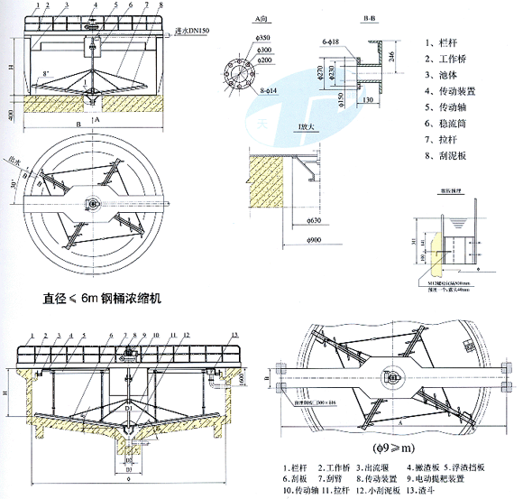 主要用于礦山、冶金、鋼鐵、煤碳等行業(yè)污水處理工程中,對含固料漿濃縮脫水。池徑∮≤6m時,一般可作成鋼制濃縮池與濃縮機成一體的形式供貨,也可單獨提供濃縮機,池徑∮≥9m時,只提供濃縮機。